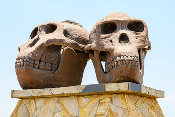 Sculpture of Skulls of Paranthropus (left) and Homo Habilis (right) at the entrance Olduvai Gorge Museum. Ngorongoro Conservation Area, Tanzania
