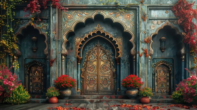 illustration fantasy background wallpaper of beautiful rose flower at ancient palace garden yard