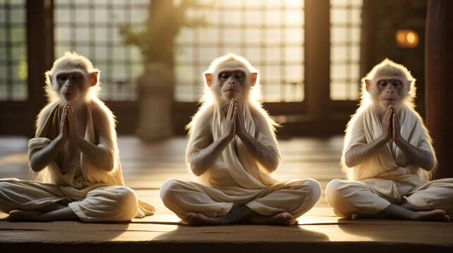 Monkeys doing yoga pose in orange and white coats in nature and in wooden buildings