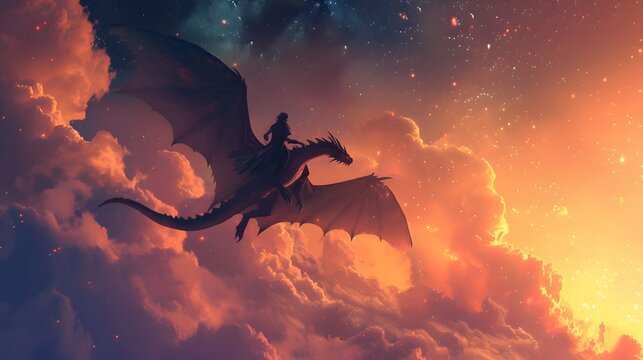 Silhouette of a dragon rider soaring through a fiery sunset sky.