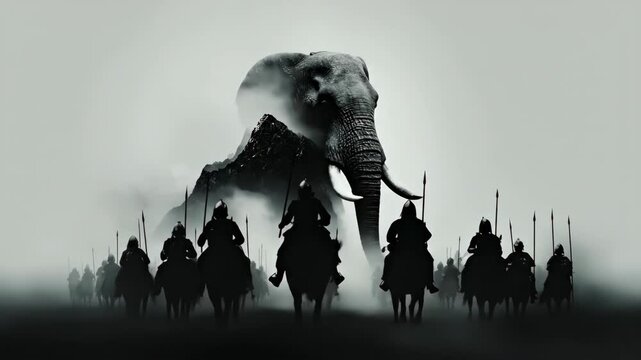 Ancient warrior cavalry rides through a misty landscape with an elephant and mountain overlay, battle footage