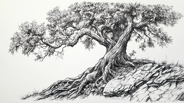 Majestic tree,  roots, and rocks. Detailed ink illustration of an ancient tree with extensive roots on a rocky outcrop