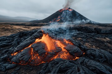 An intense lava flow snakes its way down the landscape near an active volcanic mountain, displaying the power and heat of molten earth under a cloudy sky.