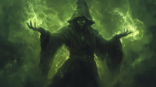 Portray a mystical sorcerer casting spells of enchantment, weaving together ancient incantations to shape the fabric of reality. sorcerer. illustration. Sorcerer's Spell. Illustration