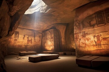 ancient rock paintings under dramatic lighting, created with generative ai