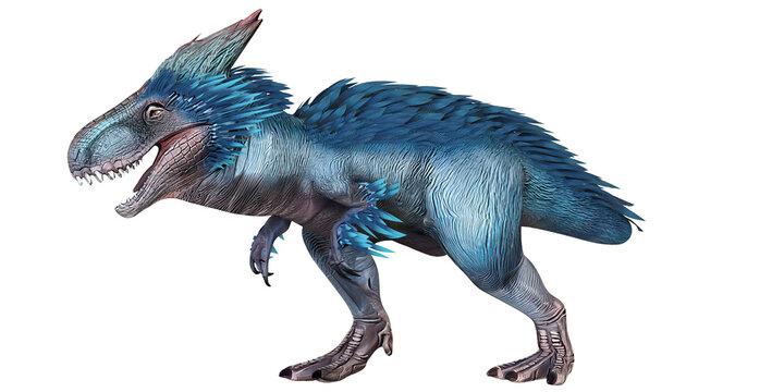 Fierce blue dinosaur illustration with sharp teeth.