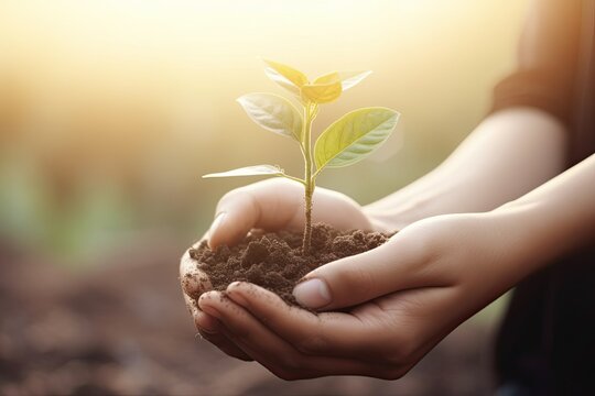 Plant in Indian hands, Environmental awareness concept, Lower carbon emissions 2050 ESG goals, Generative AI