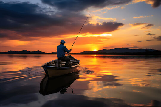 Asian fisherman on wooden boat casting a net for catching freshwater fish in nature river.