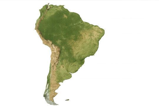 South america continent map showing physical geography and topography, featuring andes mountains with transparent background