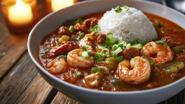 A steaming bowl of authentic Louisiana seafood and sausage gumbo featuring succulent shrimp spicy sliced andouille sausage tender okra and a rich dark rouxbased stew served over fluffy white rice sho.