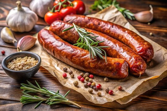Freshly sliced rustic andouille sausage on white butcher paper, surrounded by a medley of aromatic seasonings and herbs: paprika, coriander, and parsley.