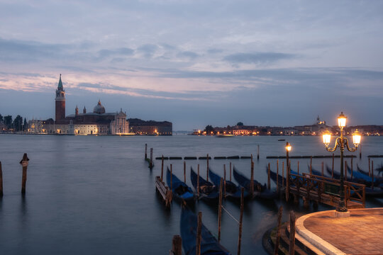 Evening view of gondolas on the wave and San Giorgio Maggiore, Venice