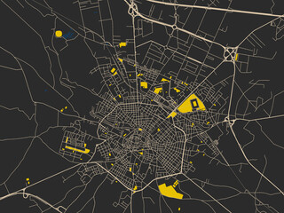Flat city map of Andria, Italy — deep charcoal background with clean cream streets and sharp safety-yellow highlights, accented by ink-blue water