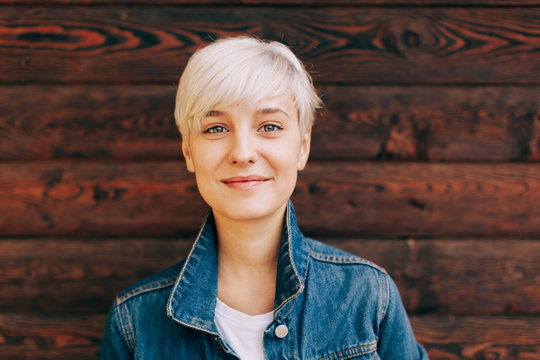 Vintage style portrait of young smiling woman with short blonde hair and fancy makeup