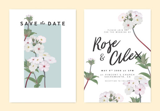 Botanical wedding invitation card template design, Woolly rock jasmine flowers bouquet on dark blue, pastel vintage theme