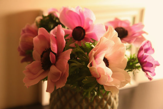 Bouquet di romantici anemoni rosa in vaso, dettaglio