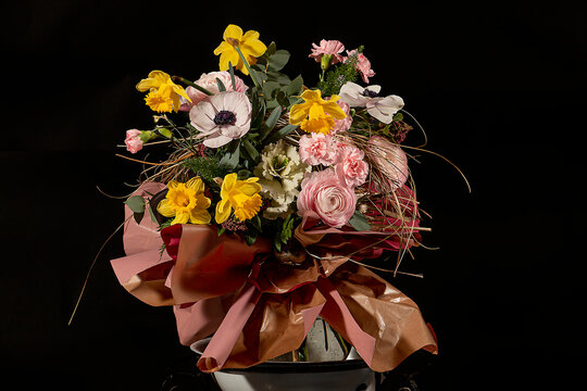 composizione floreale con anemoni ranuncoli e rose