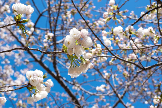 Looking up into a tree to view delicate white flowers on a tree branch in front of a perfectly blue sky