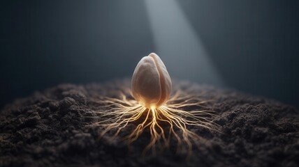 Tiny seed germinating in rich soil, golden roots spreading as life begins anew under a soft beam of light, symbolizing hope and growth.