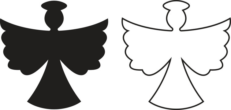 Angel silhouettes black flat, outline icons set. Holy spirit wings halo vectors collection, religious guardian celestial figure symbolic illustration for Christmas, faith, spirituality and heaven art.