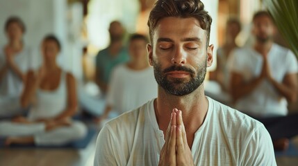Serene Man Meditating in Bright Yoga Studio with People in Background