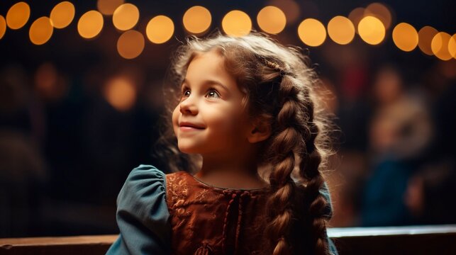 A shot of Cute little girl with braids in a red dress sitting in the auditorium. Generative AI
