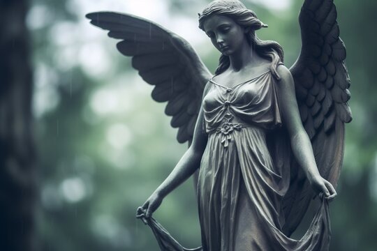 Scary angel of death haunted graveyard concept. A shadowy figure looms over weathered gravestones in a dark, eerie cemetery.