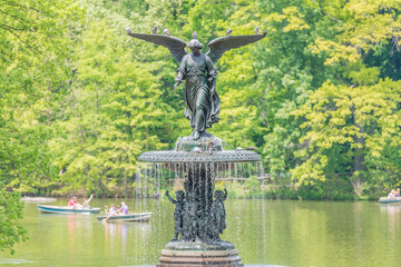 Boot fahren im Central Park, New York, Bethesda Fountain im Vordergrund