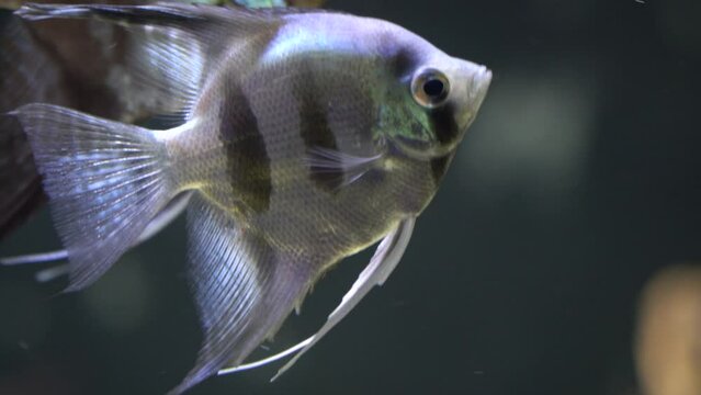 portrait of a zebra Angelfish in tank fish with blurred background (Pterophyllum scalare)