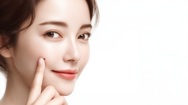 Portrait of a smiling young teenage woman with a large birthmark on her face looking at camera with gray-green eyes in peach beige hoodie with loose tousled hair on a white background copy space