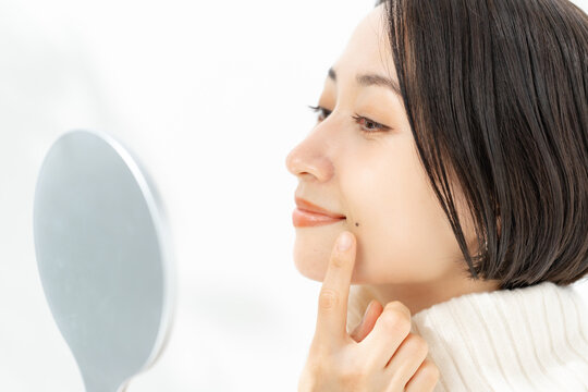 Woman with magnifying glass showing mole and birthmark on her body for prevention of melanoma and nevus exam. Mole dermoscopy