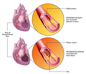 medical vector illustration of the human heart and the effects of a reversible and a progressive angina