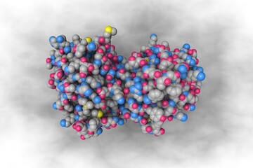Molecular model of the fibrinogen-like domain of human angiopoietin-3. Rendering based on protein data bank. Scientific background. 3d illustration