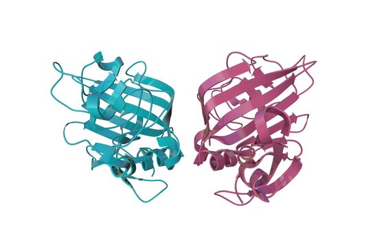 Crystal structure of angiopoietin-1 fibrinogen-related domain. Ribbons diagram with differently colored protein chains based on protein data bank. Scientific background. 3d illustration