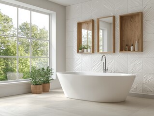 A beautifully designed living room with wooden furniture, plants, and a large window.
