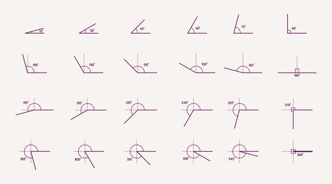 Different Angles degrees template set. Measure and geometric math symbol collection set. Educational school learning. trigonometry school lesson