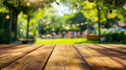 A wooden table with a view of a park with lights hanging from the trees