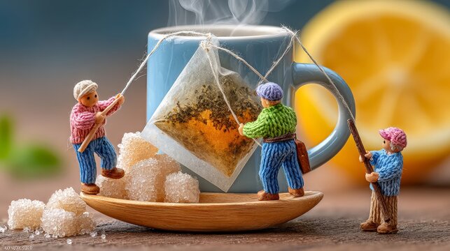 Escena divertida de pescadores en miniatura preparando una taza de té con limón y azúcar