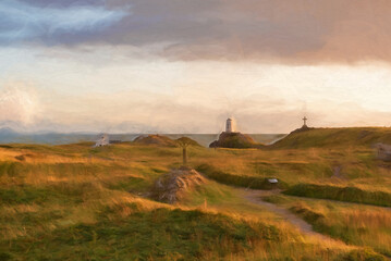 Digital painting of the Llanddwyn island lighthouse, Twr Mawr at Ynys Llanddwyn on Anglesey, North Wales.