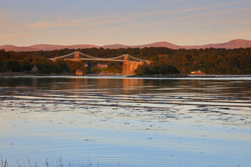 The Menai Suspension Bridge bathed in warm evening light with Snowdonia Mountains in the background. Anglesey, North Wales, UK.