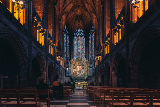 LIVERPOOL, ENGLAND, DECEMBER 27, 2018: The Lady Chapel in Liverpool Anglican Cathedral. Perspective view of a magnificent part inside the church, where light meets darkness all along place.