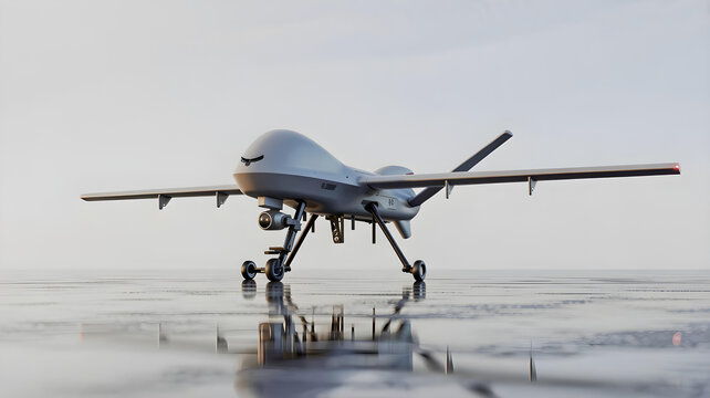 Surveillance UAV drone front angle on white, sleek with sensor and propeller.
