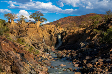 Baobab tree at Epupa Falls, scenic waterfall at edge of northern Namibia and Angola, Africa.