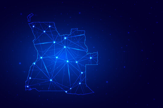 Abstract Map of Angola from polygonal blue lines and glowing stars on dark blue background. Vector illustration eps10