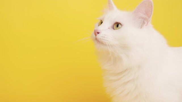 White cat with different color eyes,kitten with blue and yellow eye lies on table,fluffy cat and pink ears with multicolored eyes, heterochromia.