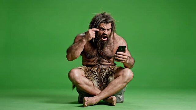 Caveman interacting angrily with smartphone on Green Screen