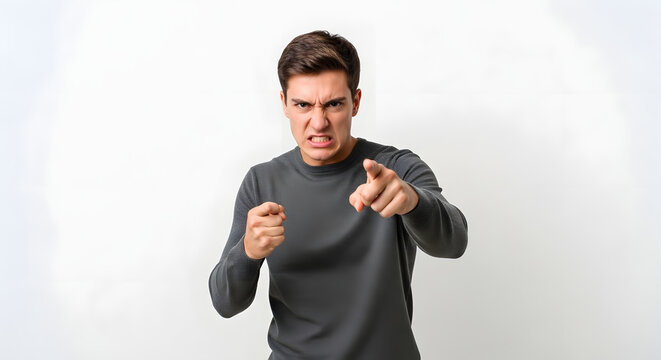 Close-up portrait of an angry man with a furrowed brow and intense expression, glaring directly at the camera against a plain background.