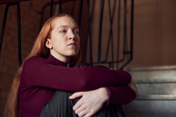 Young redhead woman sitting on stairs