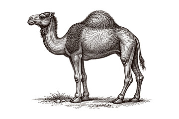 Detailed vintage camel illustration: elegant desert animal sketch in black and white
