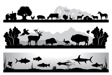 set of black and white landscapes wildlife, farm, marine life